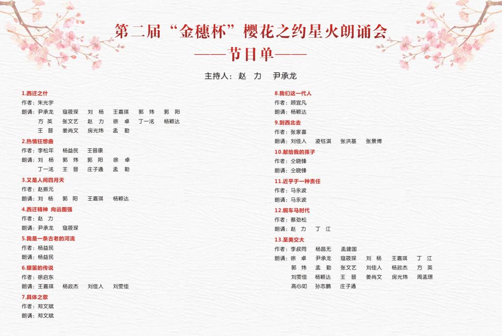 兹定于 2019年5月18日(本周六)19:00在学校科学馆101举行回馈母校最新第二届“金穗杯”樱花之约星火朗诵会。届时,将有来自海内外的20名曾经获得过当年学校“樱花”征文奖和“星火”朗诵奖的校友专程回校参加活动,与师生同台,共抒母校情怀。
