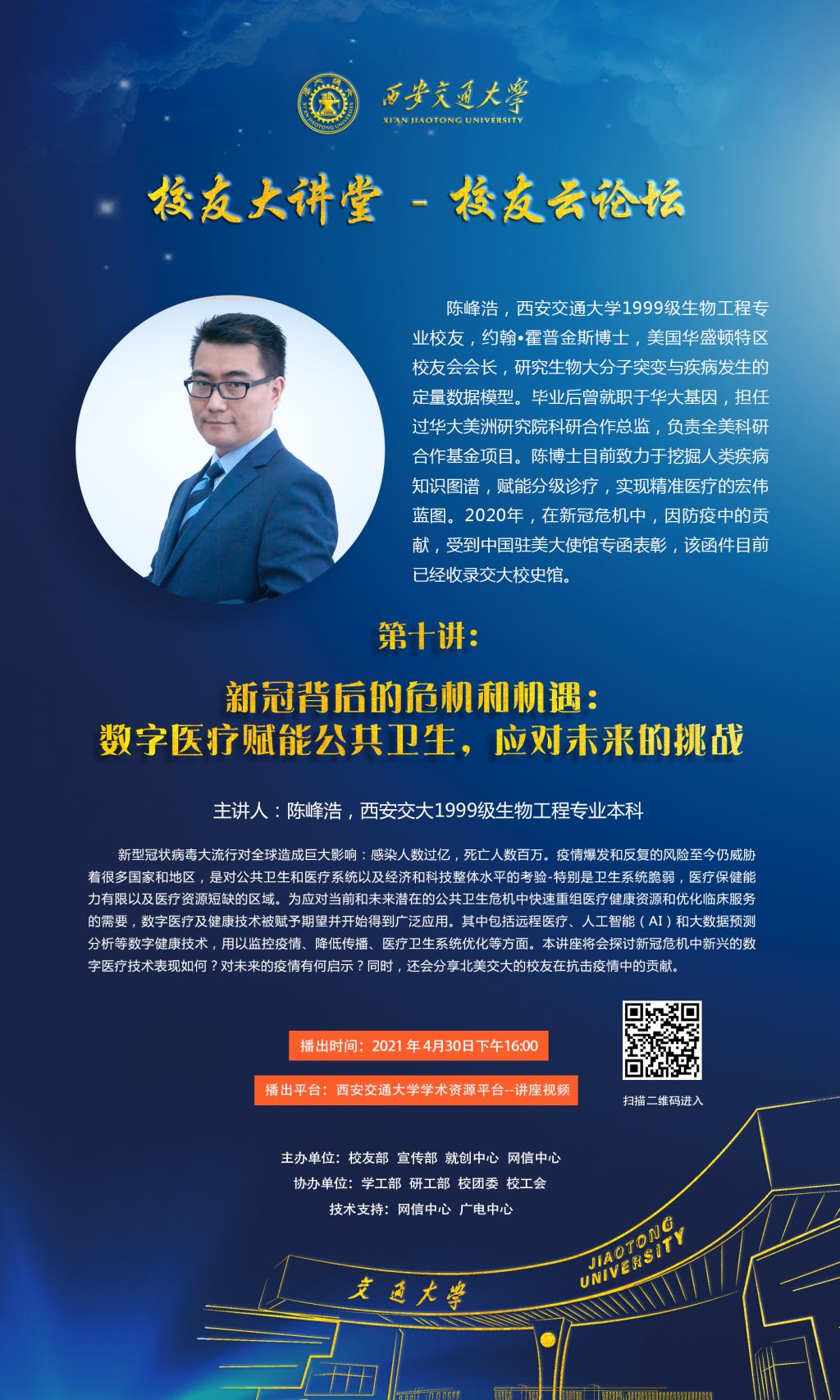 新型冠状病毒大流行对全球造成巨大影响:感染人数过亿,死亡人数百万。疫情爆发和反复的风险至今仍威胁着很多国家和地区,是对公共卫生和医疗系统、以及经济和科技整体水平的考验-特别是卫生系统脆弱,医疗保健能力有限,以及医疗资源短缺的区域。为应对当前和未来潜在的公共卫生危机中,快速重组医疗健康资源和优化临床服务的需要,数字医疗及健康技术被赋予期望,开始得到广泛应用。其中包括远程医疗,人工智能(AI)和大数据预测分析等数字健康技术,用以监控疫情,降低传播,医疗卫生系统优化等方面。本讲座将会探讨新冠危机中新兴的数字医疗技术表现如何?对未来的疫情有何启示?同时,还会分享北美交大的校友在抗击疫情中的贡献。