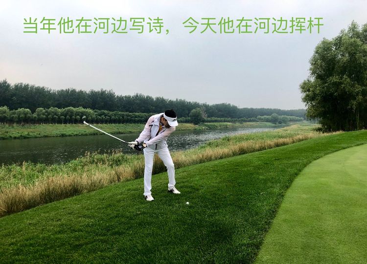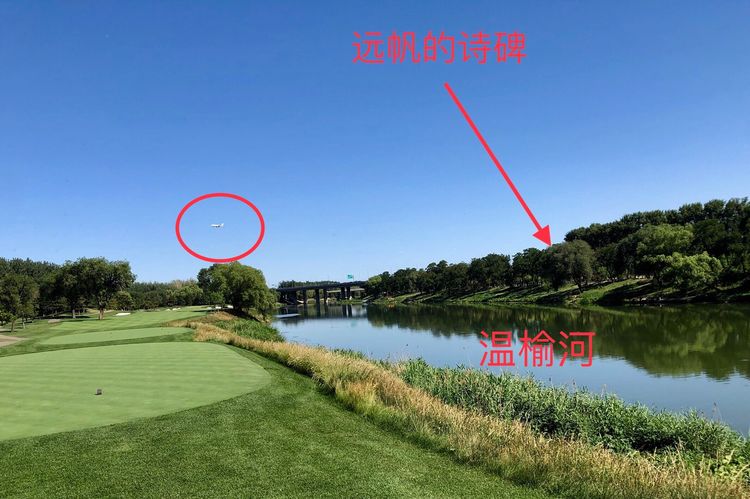 他答:诗碑的河对面是个高尔夫球场。