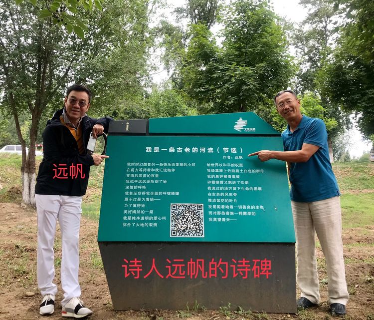 2018年,他的一个朋友在温榆河畔骑车,路过了一个诗碑,诗的名字:《我是一条古老的河流》,诗的作者:远帆。朋友在诗碑前打电话告诉了他,惊喜过后,他专门飞到北京看个究竟。