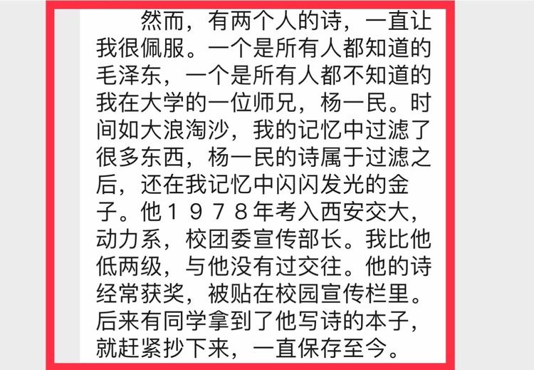 除了交大书记评价诗人外,还有校友们的评价。这位师弟是这样评论杨一民的: