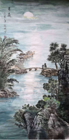 欣赏远方楼吊脚,依山临枕河床。扁舟一叶客凭窗。清辉独享,作画墨生香。