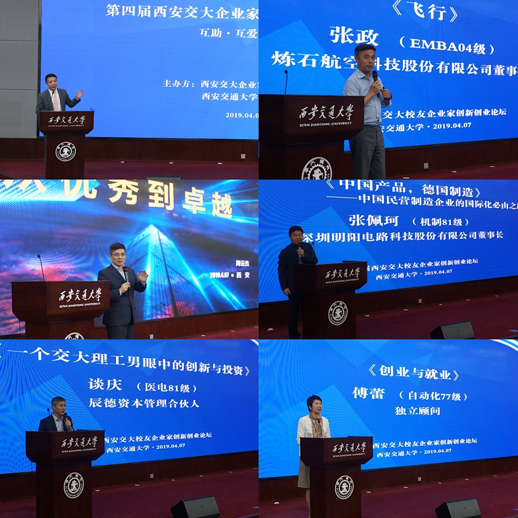 论坛上,西安交大EMBA04级校友、炼石航空科技股份有限公司董事长张政,西安交大工商管理00级博士、海尔集团总裁周云杰,西安交大医电81级校友、辰德资本管理合伙人谈庆,西安交大机制81级校友、深圳明阳电路科技股份有限公司董事长张佩珂以及西安交大自动化77级校友、独立顾问傅蕾分别做主题演讲,与大家分享了创业经历。