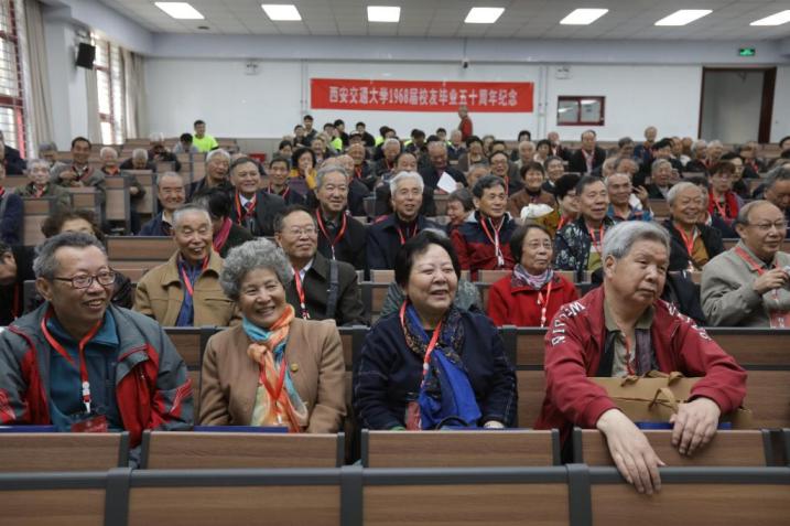 还是原来的地方,原来的教室,毕业50年后的今天,老校友们仍然像当年的学生一样,在“上课”的时间整整齐齐坐到教室,聆听老教授讲述西迁精神,感受母校这五十年的风云巨变。再次踏进这间教室,感叹五十年转瞬即逝,虽然眼里没有了十八岁那年初为成人的稚嫩,却有着一种说不出的感慨,一种久违的默契,一种好久不见的问候。