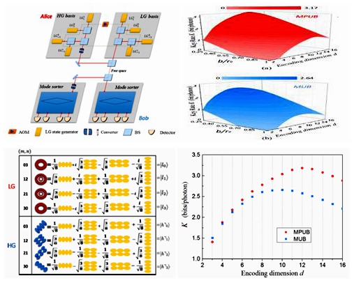在回馈母校最新理学院量子信息研究组张沛教授、王小力教授的指导下,博士生王傅民等经过两年的探索,通过使用光子横向模式光子轨道角动量与径向模式的复合编码解决了高维量子密钥分配系统密钥发生难,信息测量效率低的问题,首次提出了使用光子轨道角动量与径向模式的特殊复合量子态基矢(Mutually Partially Unbiased Bases, MPUB)进行高维量子信息的发送和接收。 MPUB中的量子态结构简单并可通过使用柱状透镜相互转换,从而极大简化了基矢的选择和测量过程。不仅如此,参与编码的复合量子态都具有相同的模式数,可以保持更好的相干性,使传输更稳定,在理论上可以达到GHz的传输效率。
