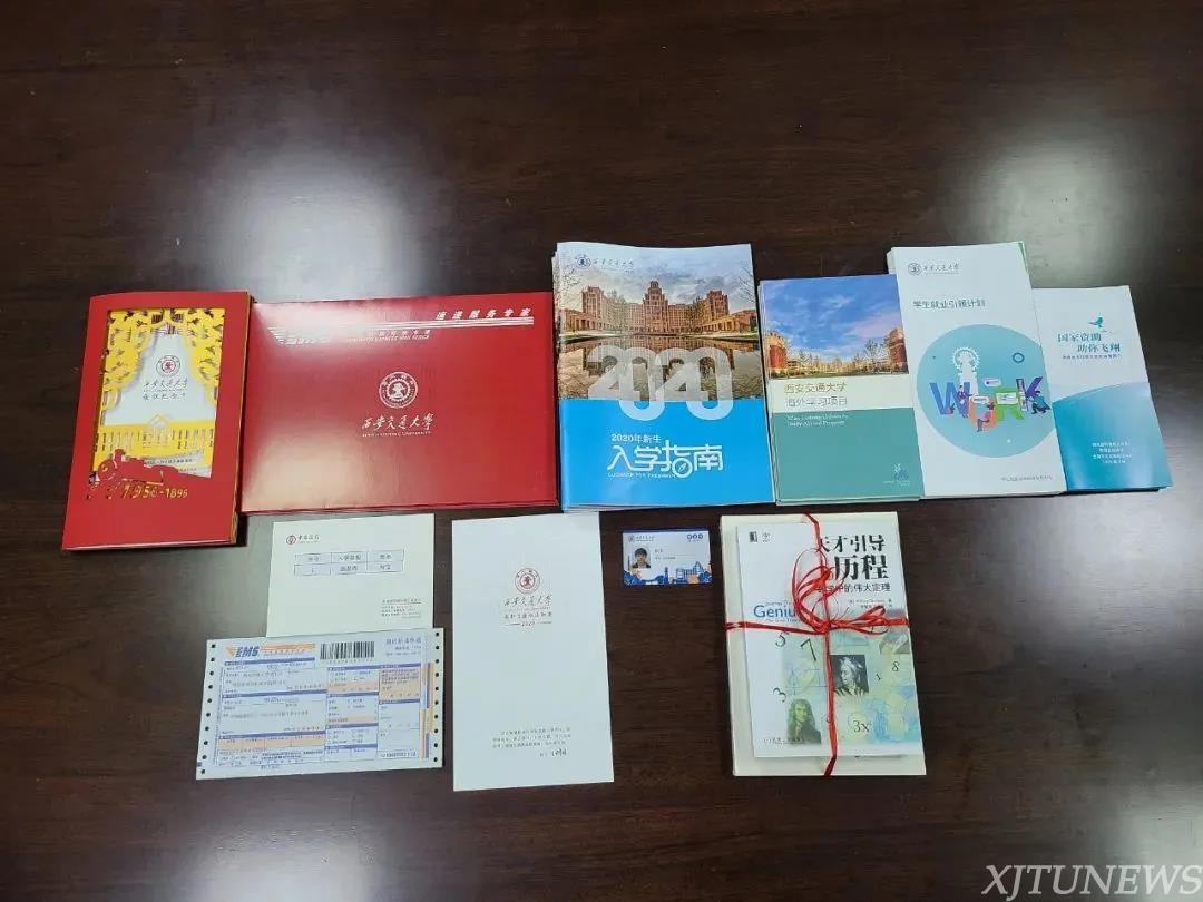 随录取通知书一起寄出的还有新生入学指南、校园一卡通、银行卡、国家资助简介、海外学习项目简介、就业引领计划简介。拿到通知书的同时,刘同学就可以全面了解交大,做好各项入学准备了。
