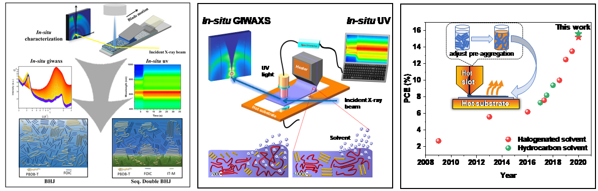 有机太阳能电池因为其柔性、质轻、可以溶液法加工等特点长期以来受到广泛的关注。得益于非富勒烯受体的快速发展,有机太阳能电池单节效率已经突破18%。然而目前高性能的器件大多通过实验室中小面积旋涂成膜制备得到,为了进一步适应商业化应用的要求,发展大面积印刷加工技术迫在眉睫。狭缝挤出成膜结合卷对卷加工是最有望实现有机太阳能电池大面积印刷的技术。不同于旋涂加工的溶剂快速蒸发成膜过程,加上剪切力的作用,印刷加工的成膜过程是个缓慢且复杂的过程,容易造成薄膜内部的结晶和相分离尺寸过大,从而降低器件性能。因此,如何调控印刷加工过程的聚集/结晶动力学获得合适的结晶和相分离形貌是制备高性能印刷电池器件的关键。在有机太阳能电池领域,通过印刷加工动力学调控活性层形貌制备高性能有机太阳能电池的策略鲜有报道。