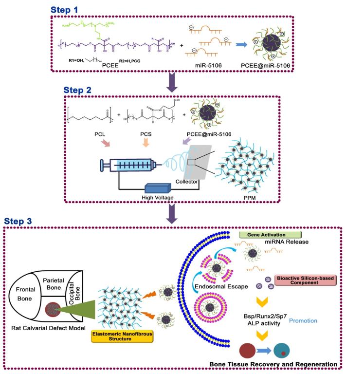 图1 多功能生物活性弹性纳米纤维支架:弹性(物理)/硅释放(化学)/miRNA控释(生物)协同策略促进骨组织再生
