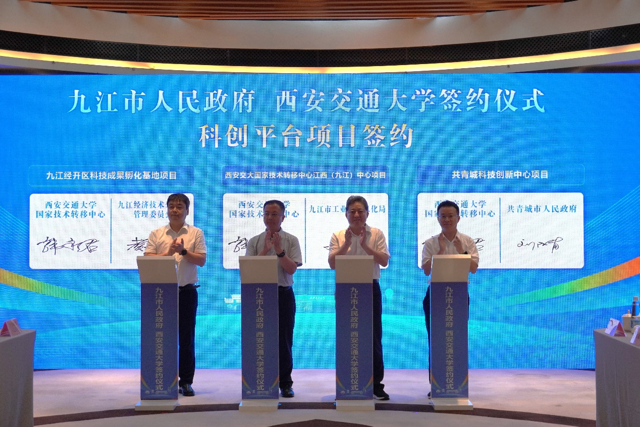 西安交大国家技术转移中心就江西(九江)中心、九江经开区科技成果孵化基地、共青城科技创新中心项目与九江市工信局、九江经开区、共青城市签约。