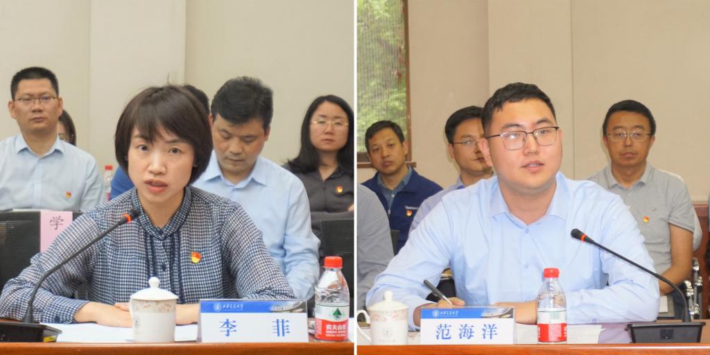 与会师生代表也作了交流发言。教师代表、生命学院教授李菲介绍了她所在的党支部以作风建设为突破口,破解科研教学难题、打造高效科研团队、构建交叉创新生态的生动实践。她表示将持续发挥党支部堡垒作用和党员先锋模范作用,立足岗位助力学校高质量发展。物理学院、励志书院本科生范海洋用“西迁思政课、专业基础课、科研实践课”概括了他求学中的三段经历。他表示将在教育夯基、科技攻坚、人才接力中努力奋斗,用青春为中国式现代化挺膺担当。