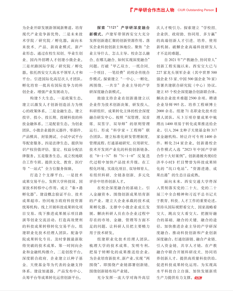 实施“6352”工程汇聚创新资源。卢建军带领西安交大深入实施“6352”工程,推动“政产学研用金”6种要素进创新港,一体化部署现代产业、未来技术、丝路国际3个学院/研究院/ 孵化器,厚植政策、金融、配套、法律、服务5种生态,打造创投和交易两大平台,加快构建全要素全链条科技创新生态。