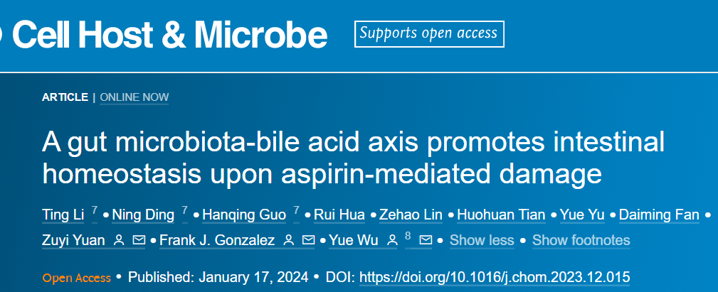 该成果发表于细胞杂志的微生物领域子刊《细胞-宿主与微生物》。论文系统阐明了阿司匹林引起肠道损伤的新机制,并首次提出通过“肠道菌群-胆汁酸轴”进行干预的策略,为阿司匹林等心血管药物副作用的防治提供了全新思路。阿司匹林作为全球最常用的药物之一,广泛应用于镇痛、抗血小板和肿瘤预防等领域。然而,其引发的胃肠道损伤问题长期困扰临床,超过90%的长期服药患者出现不同程度的肠道不良反应。尽管过去研究多关注于阿司匹林对前列腺素合成酶的抑制作用,但其引起肠道损伤的具体机制仍不明确。