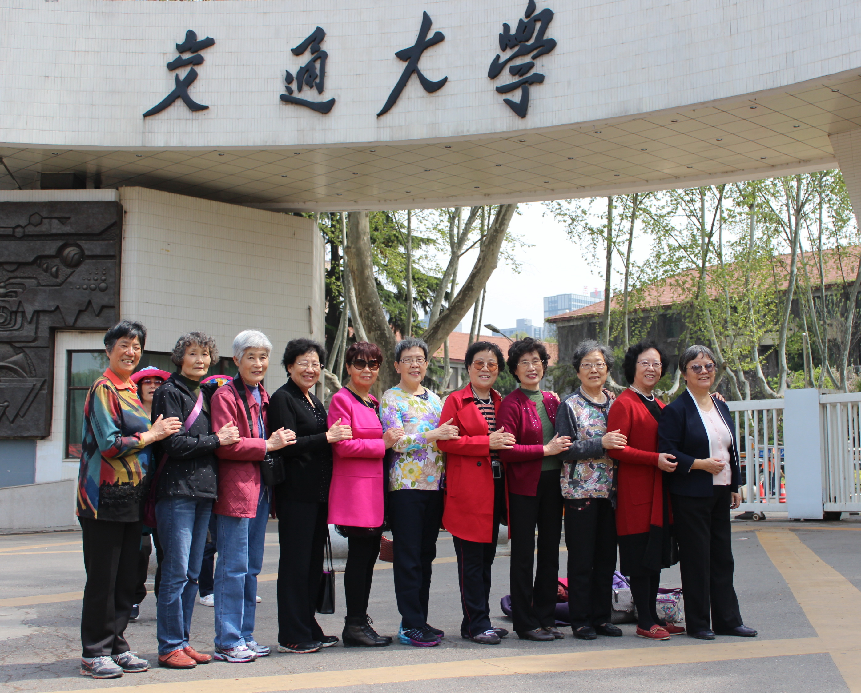 午餐后,我们先来到西边的牡丹园,又是一片令人陶醉的美景!各色牡丹姿态优美,争芳斗艳,让人目不暇接,心旷神怡!于是,一张张个人的多人的牡丹园美照就留在了手机里。中心楼前的饮水思源雕塑和喷水池依然保留着原来的模样,只是周围的塔松和梧桐树变得更加粗壮挺拔,那一个个各种鲜花围成的小花坛点缀着行政楼前的广场,我们姐妹们围坐在饮水思源的喷水池旁留下了一张纪念照。过后我们一起来到北校门外,我们当初入校,离校和现在,见证过母校的三个北校门,唯有现在这个北校门最为气派和壮观!她那白色的弧形设计,可能意为拥抱来自五湖四海的莘莘学子吧。我们这11位来自五湖四海的老交大学子在这壮观的校门前留下了一张最幸福的合影,当然,每个队友还要来一张单独的纪念照,这是终生不能忘怀的2017年的4月11日下午。