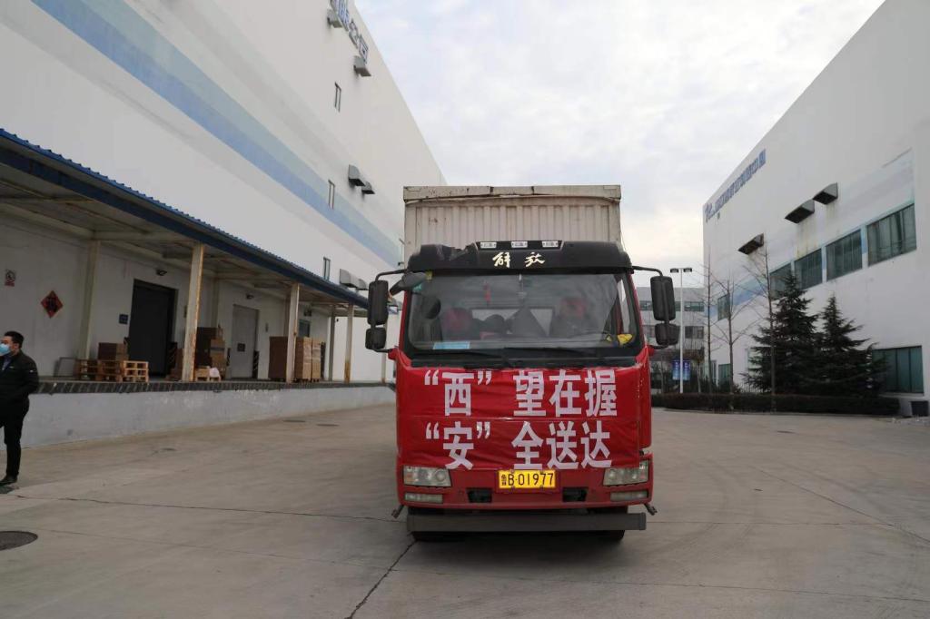 为解决我们的运输难题,将母校急需的抗疫物资迅速、安全、及时地运抵西安,分发给母校5000名志愿者和坚守岗位的最可爱的人,海尔集团董事局主席周云杰、总裁梁海山专门调拨海尔日日顺物流车辆负责青岛校友会捐助物资的运送工作。12月28日下午3点40分,满载捐助物资的海尔日日顺物流抗疫物资专车——“西”望在握,“安”全送达,从青岛华仁药业公司株洲路厂区出发, 带着给青岛校友们的承诺, 载着青岛校友对母校的深情和祝福驶向西安。“西”望在握,“安”全送达!司机师傅们不辞辛苦、星夜兼程,海尔日日顺物流车于29日晚22:12分抵达创新港,将物资移交到母校工作人员手中。