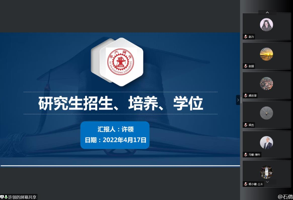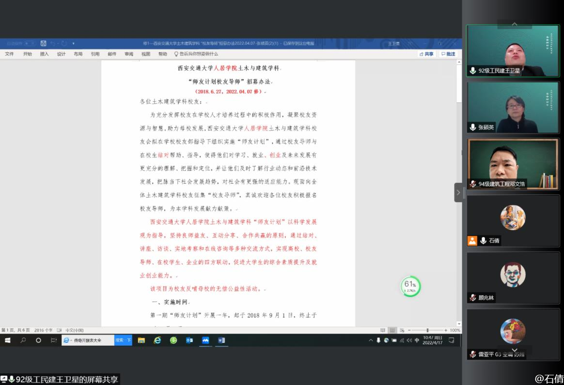 4月17日上午,回馈母校最新土木与建筑学科校友会2022年春季研讨会于线上召开。土木与建筑学科校友会会长刘斌、秘书长王卫星,西安交通大学校友关系发展部副主任赵力,人居学院党委书记杨鹏,常务副院长顾兆林,副院长张硕英、许领以及人居学院系所领导、校友会理事、教师及校友代表参加本次会议。会议由人居学院副院长、土木与建筑学科校友会执行秘书长张硕英主持。