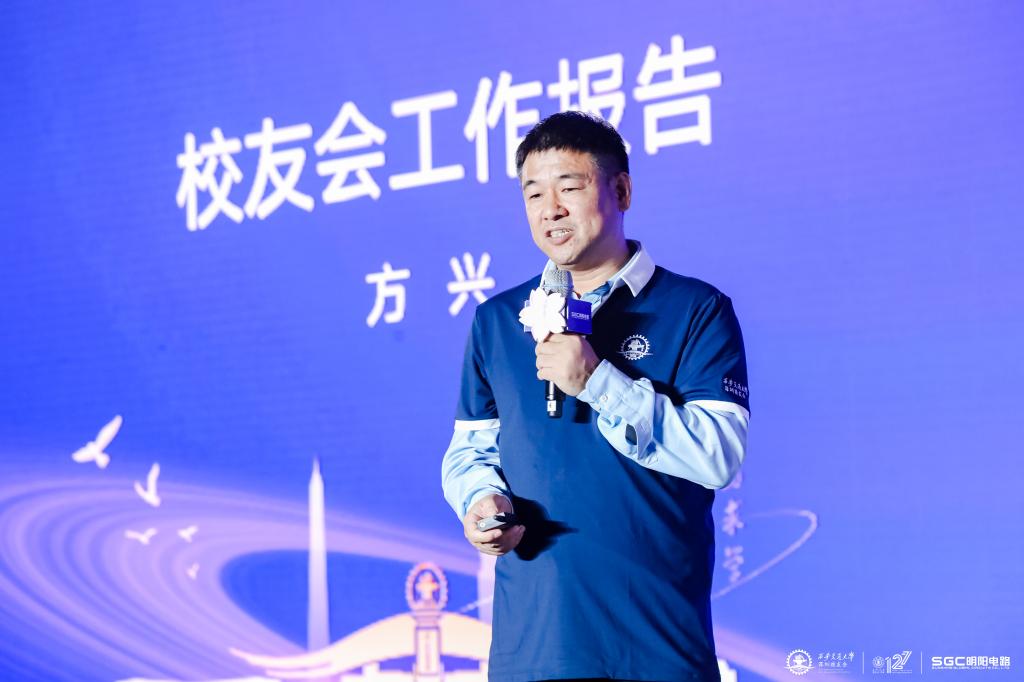 1990级校友、深圳市校友会秘书长兼副会长、深圳盛弘电气股份有限公司董事长方兴代表深圳校友会新一届理事会报告深圳校友会2021年换届后的主要工作及取得的成就。他表示,深圳校友会换届后焕发出新的气象,广大在深校友心系母校发展,在助力母校招生就业、创新创业大赛等方面作出积极的贡献;校友会也利用企业微信等搭建多渠道互动平台服务校友,同时精心打造校友品牌活动,扩大社会影响力,组织主题沙龙、迎新送新、优秀企业参观、思源汇客听论坛等几十项活动。未来,深圳校友会将充分汇聚校友资源,共谋发展新篇章。
