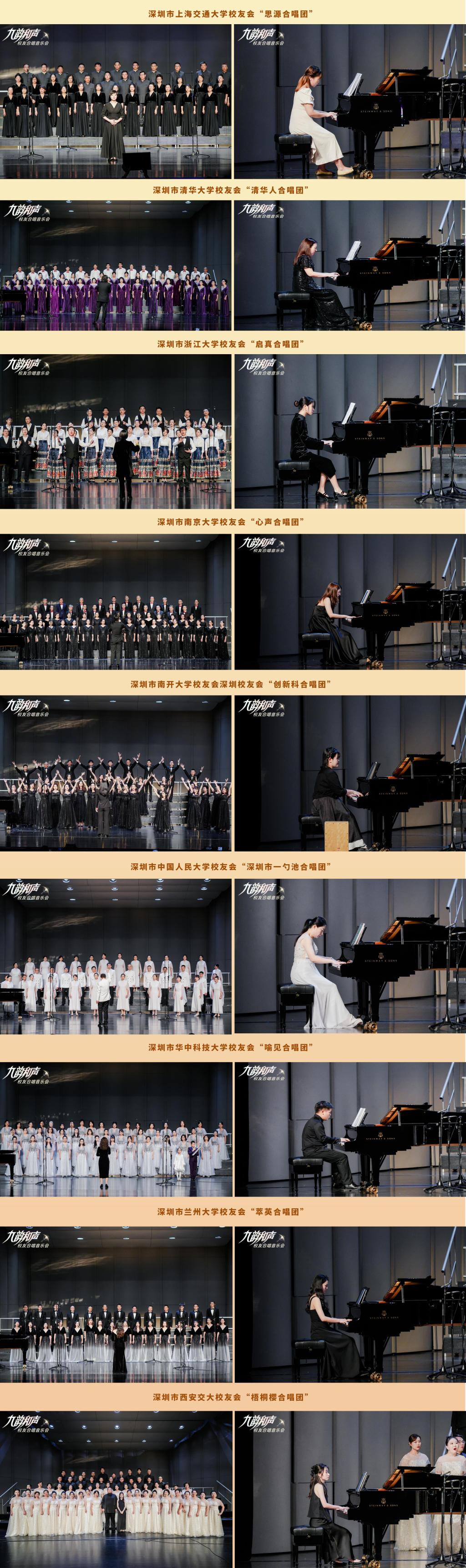 音乐会上,深圳市上海交通大学校友会“思源合唱团”、深圳市清华大学校友会“清华人合唱团”、深圳市浙江大学校友会“启真合唱团”、深圳市南京大学校友会“心声合唱团”、深圳市南开大学校友会深圳校友会“创新科合唱团”、深圳市中国人民大学校友会“深圳市一勺池合唱团”、深圳市华中科技大学校友会“喻见合唱团”、深圳市兰州大学校友会“萃英合唱团”、深圳市西安交大校友会“梧桐樱合唱团”依次献上无与伦比的精彩演绎,他们在和声中歌颂情谊,或缅怀青春、或展望未来,他们虽然来自不同行业、不同年龄段、不同背景,但音乐的力量让大家彼此链接,心意相通、同频共振。