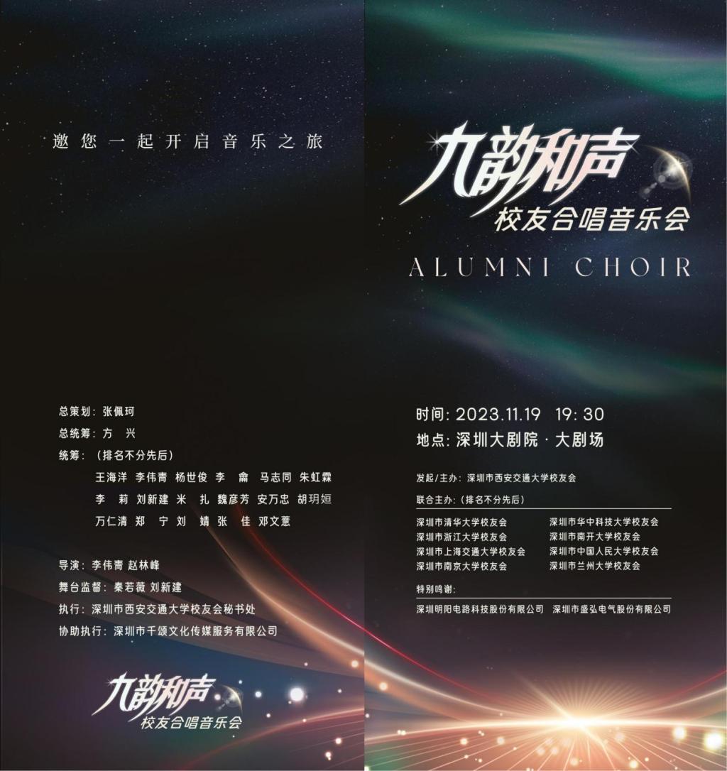 “九韵和声”音乐会由深圳市回馈母校最新校友会牵头发起,深圳市清华大学校友会、深圳市浙江大学校友会、深圳市上海交通大学校友会、深圳市南京大学校友会、深圳市华中科技大学校友会、深圳市南开大学校友会、深圳市中国人民大学校友会、深圳市兰州大学校友会联合主办。深圳明阳电路科技股份有限公司(证券代码:300739,创始人为西安交大1981级校友张佩珂)、深圳市盛弘电气股份有限公司(证券代码:300693,创始人为西安交大1990级校友方兴)倾情赞助。西安交大王新月、李凯稀校友主持音乐会。