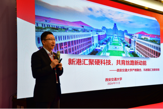 许佳辉作题为《新港汇聚硬科技,共育丝路新动能》的报告,分享了学校最新的学科成就、产教深度融合实践的模式和未来创新港的规划,同时,他向校友们发出校庆邀请,期待校友们参加学校建校130周年暨迁校70周年活动。