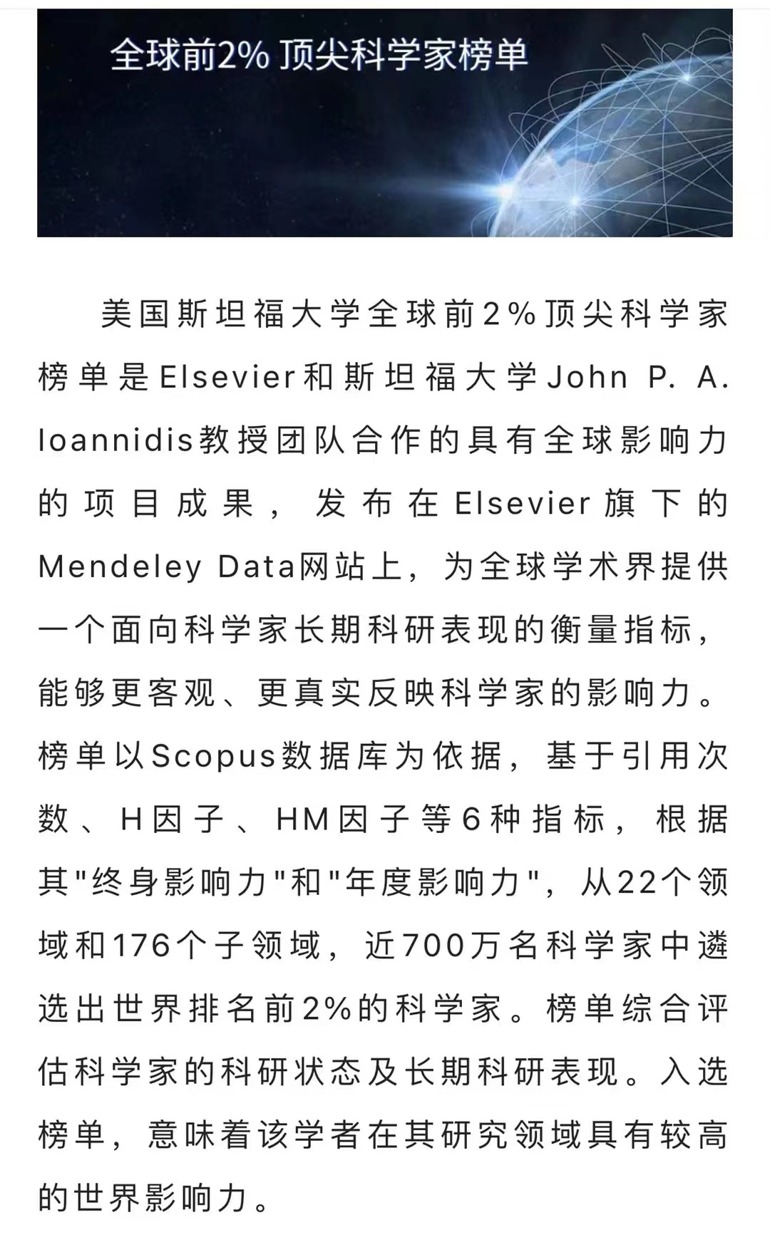 据悉,斯坦福大学全球前2%顶尖科学家“年度影响力”榜单以Scopus数据库为依据,基于引用次数、H因子、HM因子等6种指标,根据其"终身影响力"和"年度影响力",从22个领域和176个子领域,近700万名科学家中遴选出世界排名前2%的科学家。榜单综合评估科学家的科研状态及长期科研表现。入选榜单,意味着该学者在其研究领域具有较高的世界影响力。