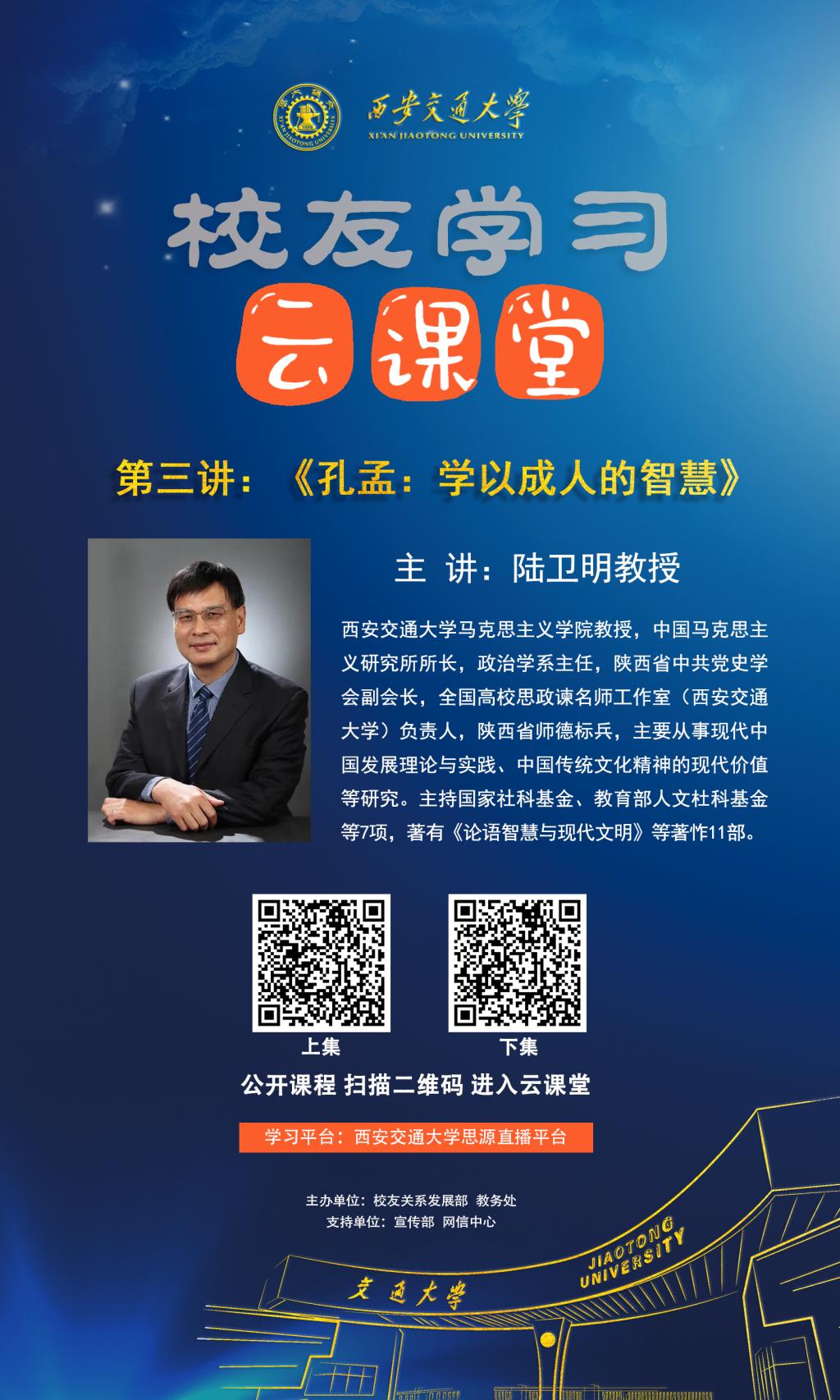 【开栏语】亲爱的校友,离开母校的你们一定会怀念在校读书的美好时光,希望有朝一日重回课堂,再次徜徉在知识的海洋。为了更好地服务校友,帮助校友拓宽文化视野、充盈知识结构,推进职场发展,母校启动了交大校友终身学习支持计划项目。设立了“交大校友学习云课堂”,于每月第一周和第三周的周六通过回馈母校最新校友会微信公众号和校友网,推送学校“领军学者讲通识”部分课程等公开讲座。欢迎广大校友在线收看!