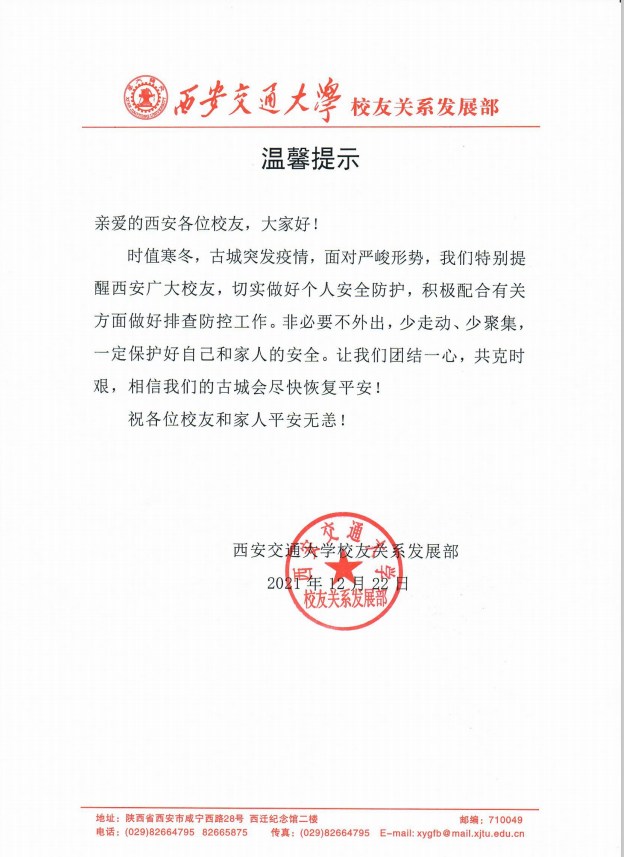 2022-01-07连日来,新一轮新冠肺炎疫情使西安备受全国人民关注,广大热心校友和企业伙伴亦无时不在牵挂着学校的疫情防控与师生的平安健康。