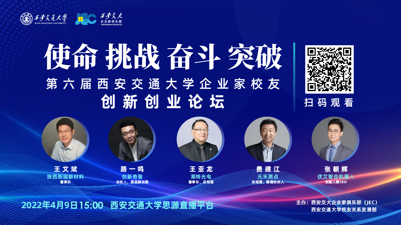 2022-04-124月9日,由校友部和西安交大企业家俱乐部(JEC)联合主办的以“使命 挑战 奋斗 突破”为主题的“第六届西安交大企业家校友创新创业论坛”举行。
